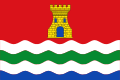 Paño de proporciones 2/3, dividido por una línea ondulada en dos partes: La superior roja con una torre amarilla aclarada de azul, situada en su centro; la inferior compuesta por cuatro franjas onduladas de igual anchura, blanca, verde, blanca y azul.